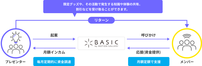 との連動 - 日々の活動を支え、叶えたい未来を実現するためのコミュニティを育てるBASIC(月額支援型クラウドファンディング)と、節目となるプロジェクトを外部に向けて大きく発信するMOTION GALLERY(プロジェクト型クラウドファンディング)は表裏一体。ページの連携や参加者管理機能によって、より一層の相乗効果が生まれていきます。
