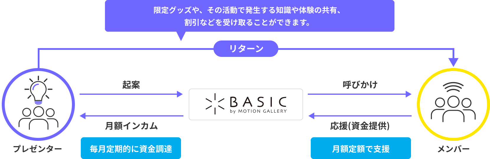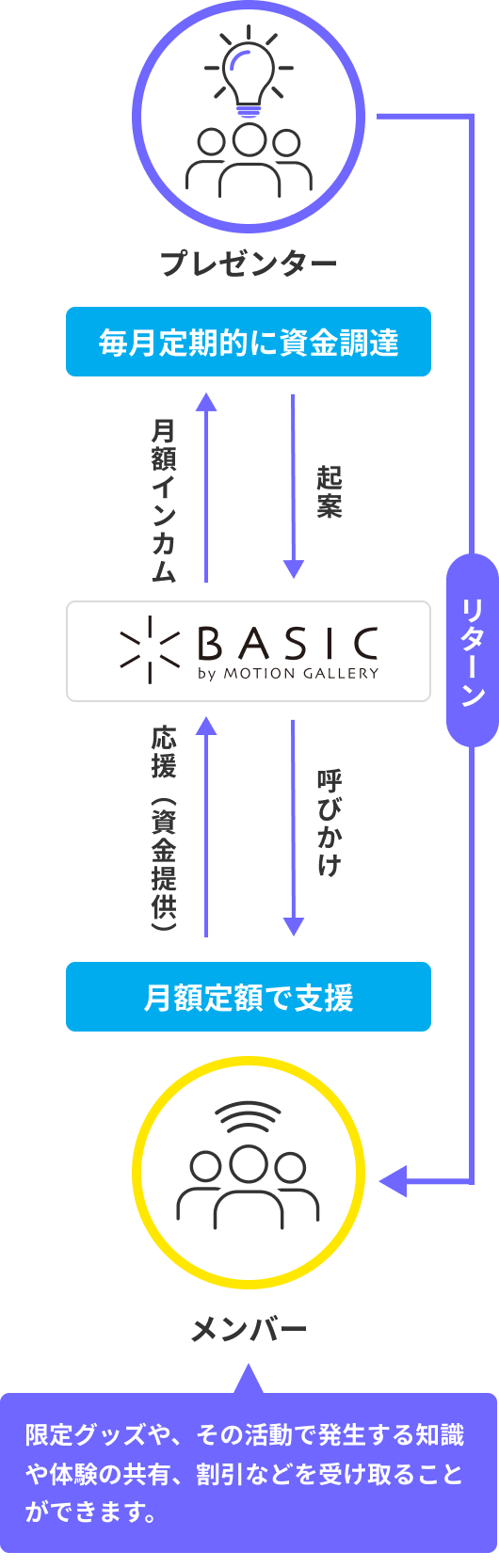 との連動 - 日々の活動を支え、叶えたい未来を実現するためのコミュニティを育てるBASIC(月額支援型クラウドファンディング)と、節目となるプロジェクトを外部に向けて大きく発信するMOTION GALLERY(プロジェクト型クラウドファンディング)は表裏一体。ページの連携や参加者管理機能によって、より一層の相乗効果が生まれていきます。